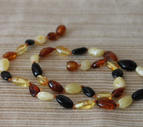 This adult Baltic Amber necklace has long, elegant, bean shaped beads representing several of the beautiful colors of Baltic Amber.