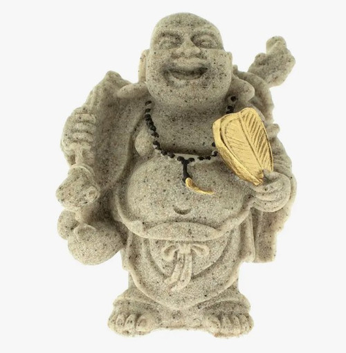 Wearing a string of prayer beads and holding a gold fan, this is another new version of our popular sandstone buddha series. The term buddha is translated as the “awakened one” and describes a state free of faults and obstructions. With a mind free of obstructions, buddha effortlessly bestows blessings upon others. Produced in a sandstone finish – the overall feel and texture is natural & realistic. When you wave a fan, it is thought to help banish bad luck and negativity from your life.