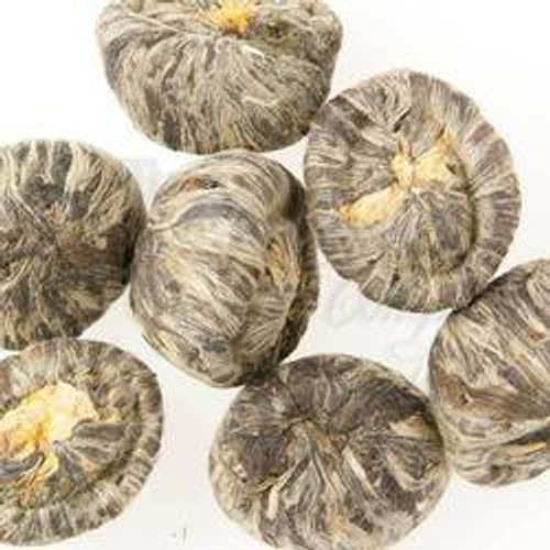 To truly enjoy all these special flowering teas have to offer, steep the ball in a glass teapot. This allows a full view of the bouquet bursting forth from the tea leaves encasing them. For safety, do not use a large wine glass, since this type of glass is not tempered and can shatter if hot water is poured into it. Most tea balls make 2-3 cups of tea. To brew, simple fill a teapot with 3 cups of just under boiling water. You know it is ready if tiny bubbles are just starting to break the surface of the water. Drop the tea ball into the teapot. If water is poured over the tea ball, it may come apart some from the force of the water. The tea usually needs to steep about 10 minutes or until the ball has fully opened. This is usually not the way to brew tea, since water that is too hot or tea steeped longer than 3-5 minutes turns bitter. The process of making the artisan tea balls allows for the non traditional brewing of the tea. Steeping the tea balls with extra hot water and for a longer period of time does not affect them since they usually have less pronounced flavor with a floral or vegetal taste. Flowering teas can also be brewed 2 or 3 times. Simply add more hot water to the pot and steep again.