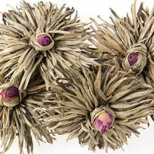Flowering teas are made from tea buds that are hand tied around one or more flowers. The tightly wound bundle of tea leaves unfurls when steeped in hot water to unfurl or “bloom” into a unique visual display revealing a deftly arranged bouquet of flowers that rise from the opened tea ball. Sometimes, the flowering tea contains no flowers and opens to reveal carefully tied leaves that are lovely to watch unfurl into the shape of a blooming flower.