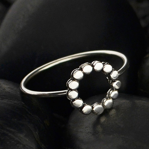 This sterling silver stacking ring features a dot pattern in a circle. The band is a classic round wire band for comfort while wearing. This circle ring makes a great gift for a friend, loved one, or yourself!