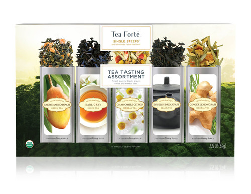 Our Single Steeps Tea Tasting assortment contains a sampling or our five classic blends of black, green and herbal teas. The tasting menu on the back of the box will guide you through the luxuriant taste of our exceptional blends. Each box includes fifteen pre-portioned pouches, three of each blend: Chamomile Citron, Earl Grey, English Breakfast, Ginger Lemongrass and Green Mango Peach. All teas in this collection are USDA Organic certified.